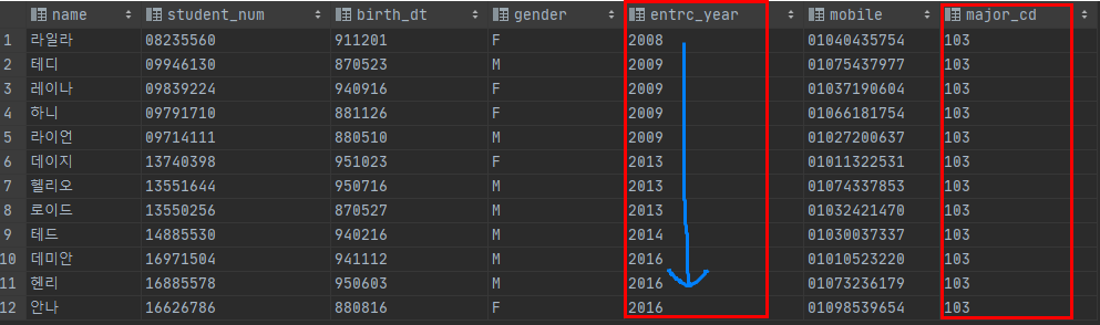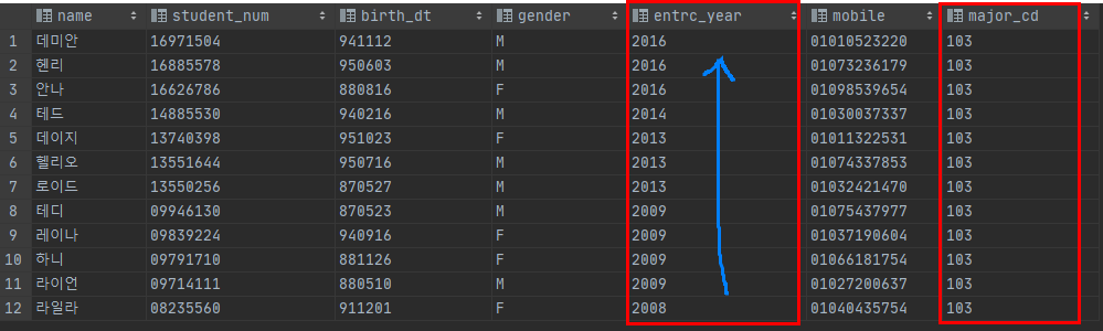 이렇게, 결과가 entrc_year 순으로 오름차순 정렬이 되어 출력됩니다.