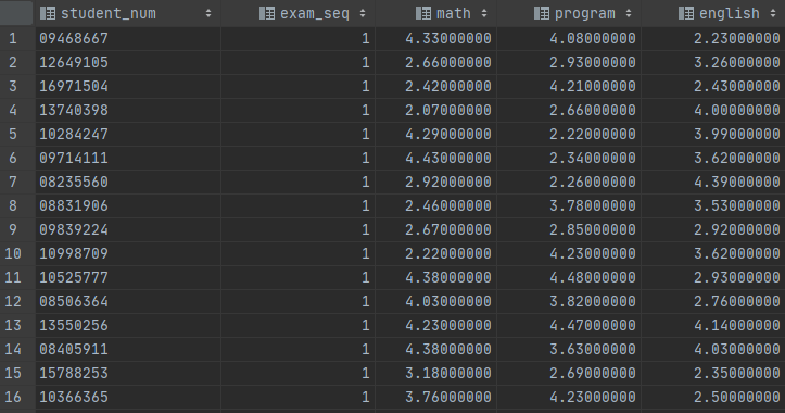 class.exam_result 테이블의 데이터는 위와 같이 있습니다. 학번이 있고, 두 번째 있는 exam_seq는 시험 회차입니다. 그리고 수학, 프로그래밍, 영어 과목의 성적 점수가 들어가 있습니다.
