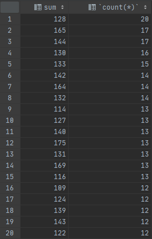 위 데이터는 첫 번째 행을 예를 들어 설명하자면, 당첨번호의 합계가 128인 당첨번호의 조합이 20번 당첨이 되었다는 것입니다.