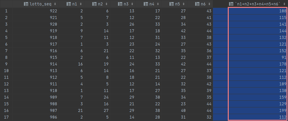 핑크색 상자로 표시된 부분이 합계이고, 가장 앞, lotto_seq는 회차 번호입니다.