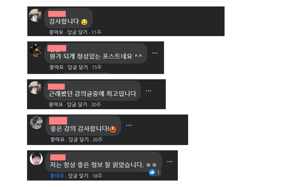 그 간절함이 통했는지, 그동안 많은 독자(?) 분들께서 이 부족한 post들을 읽어주시고, 조금이나마 도움이 되셨다는 코멘트도 Post가 공유되었던 여러 채널을 통해 아래와 같이 많이 남겨 주셨습니다.