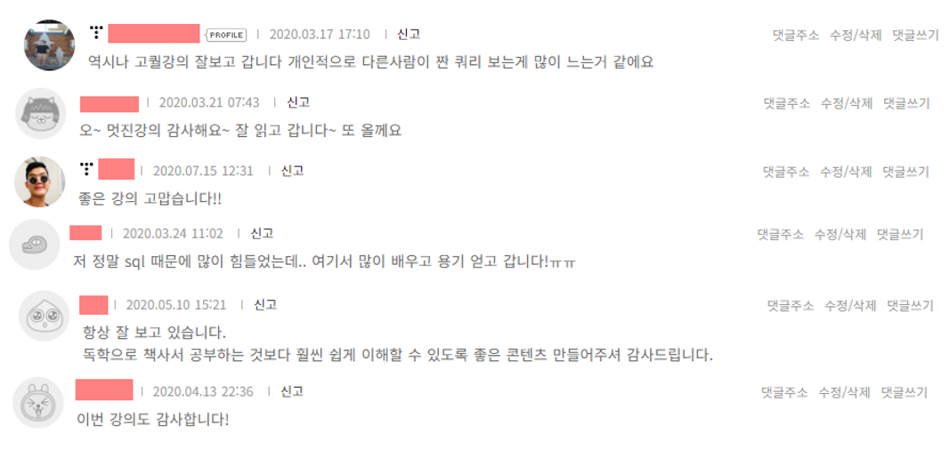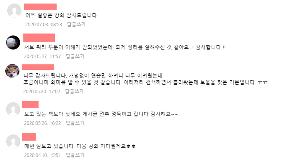 위와 같은 댓글들은 저에게는 너무나도 큰 응원이었고, 조회수가 많이 나오지 않더라도 다음 강의 post를 작성하는 데 있어 큰 힘이 되었습니다.