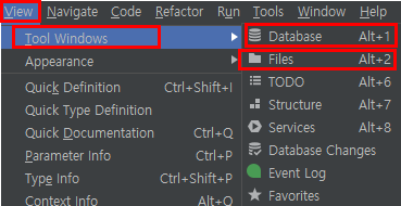 우선 기본적으로 필요한 windows를 열어 주도록 하겠습니다. 아래 그림처럼 위 메뉴탭에서 View -> Tool Windows -> Database와 Files를 하나씩 클릭해서 열어 줍니다.