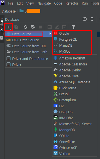 위 사진에서 처럼 "+" 버튼을 누르면 아래 Data Source 메뉴를 선택할 수 있습니다. 그리고 오른쪽에 연결을 원하시는 DBMS를 선택하시면 됩니다.
