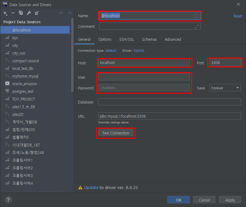 그러고 나서 아래 Test Connection을 눌러 접속 테스트를 합니다.