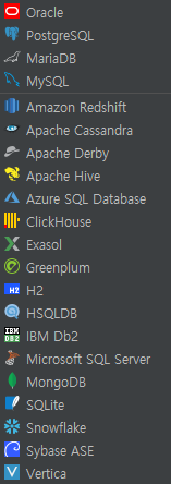 oracle, postgreSQL, mariaDB, MySQL, Amazon Redshift, Apache Cassandra, Apache Derby, Apache Hive, Azure SQL Database, ClickHouse, Exasol, Greenplum, H2, HSQLDB, IBM Db2, Microsoft SQL Server, MongoDB, SQLite, Snowflake, Sybase ASE, Vertica 등등..