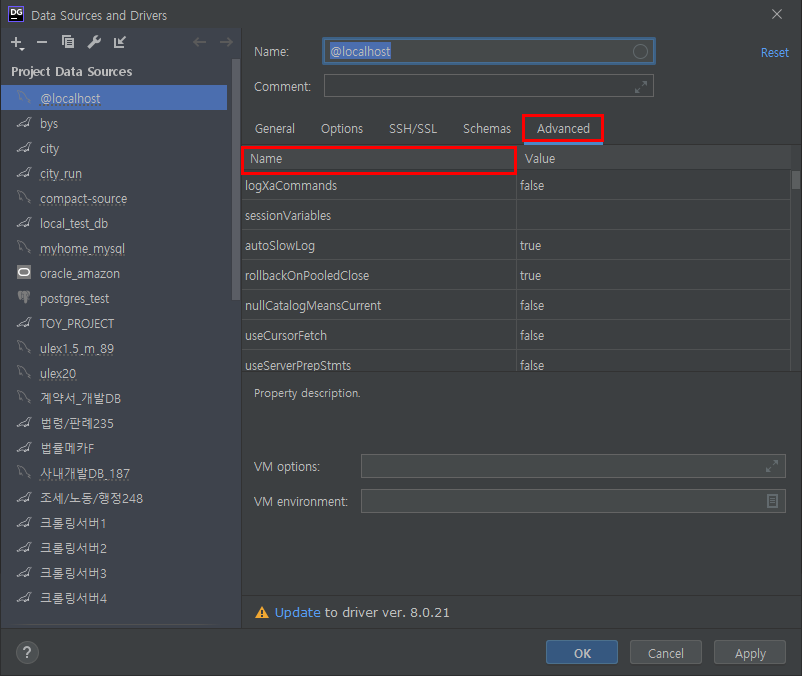 아까 서버 정보를 등록하는 그 창에서 Advanced 메뉴를 선택하여 들어갑니다. 그리고 상단의 Name 필드를 한번 누르면 아래 파라미터명들이 이름순으로 정렬이 됩니다.