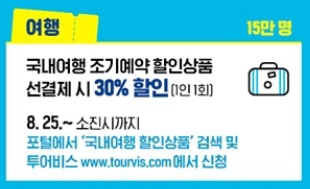여행 분야는 <투어비스> 홈페이지를 통해 오는 8월 25일부터 관계 상품을 예약할 수 있습니다. 20일까지 공모를 통해서 선정된 국내 여행상품에 대해 조기 예약, 선결제 시 선착순 15만 명에게 상품가의 30%를 할인하기로 했습니다.