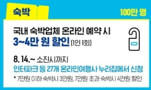 9월 ~ 10월 숙박 예약 시 7만 원 이하에겐 3만 원(20만 장), 7만 원 초과 시엔 4만 원(80만 장)이 배포됩니다.