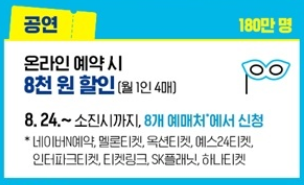 공연은 총 180만 명이 대상이며, 연국, 뮤지컬, 클래식, 오페라, 무용, 국악 등 순수공연예술에 한정하여 1인당 최대 4매 예매가 가능하며, 티켓당 8천 원씩, 총 32,000원의 할인을 받아 볼 수 있습니다.