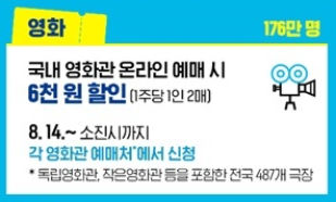 영화는 8월 14일부터 할인권이 소진될 때까지 계속됩니다. 총 176만 명에게 6천 원 할인권을 제공합니다. 할인권의 사용처는 많은 분들이 가시는 멀티플렉스 영화관 이외에도 독립*예술영화 전용관 및 작은 영화관, 개별 단관 극장 등을 포함한 전국 487개 극장에서 사용이 가능합니다.