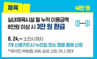 체육시설의 경우에는 8월 24일부터 시작이 됩니다. 7개 신용카드사 홈페이지에서 신청이 가능하며, 선착순 40만 명에게 할인 혜택을 제공하고, 1개월 이내 민간 실내체육시설 결제금액 누적 8만 원 이상 시 3만 원을 지원받을 수 있습니다.