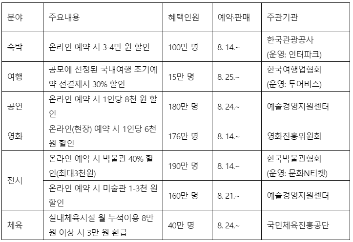 문화체육관광부가 코로나 19로 인해 가라앉아있는 국내 시장을 살리고 국민들의 안전한 여가생활을 위하여 다가오는 8월 14일부터 순차적으로 6개 분야에 소비 할인권을 지원한다고 합니다.