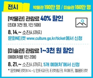 박물관은 <문화 N티켓 사이트>를 통해 마찬가지로 8월 14일부터 190만 명에게 40% (최대 3천 원, 1인당 5매 제한) 할인이 적용됩니다. 미술전시의 경우 예매처 5곳을 통해 21일부터 160만 명에게 최대 3천 원의 할인 혜택을 적용합니다.