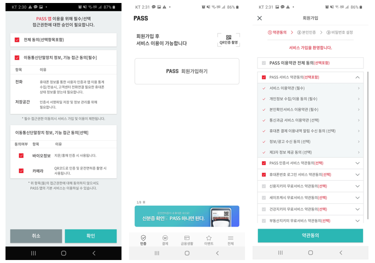 그리고 다음 화면은 <PASS> 애플리케이션의 회원가입을 할 때 이용약관 동의가 나오는데, 제가 선택한 선택 사항중 PASS 인증서 서비스, 휴대폰 번호 로그인 서비스 외 나머지는 체크 해제하셔야 전화가 안옵니다.