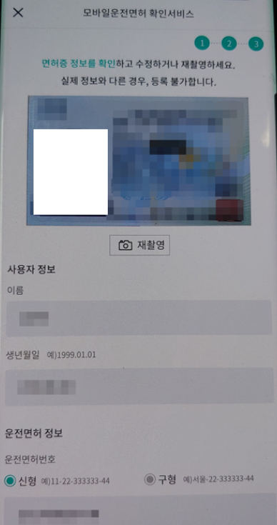 그리고 나면 실물 운전면허증을 사진을 찍고, 운전면허증 발급 정보를 자동으로 읽어오지만, 개인이 수정을 해줘야 합니다. 100% 정확하게 익식이 되지는 않더라고요.