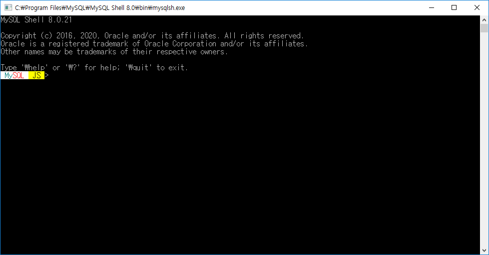 위와 같이 MySQL Shell Window가 잘 실행되었습니다.