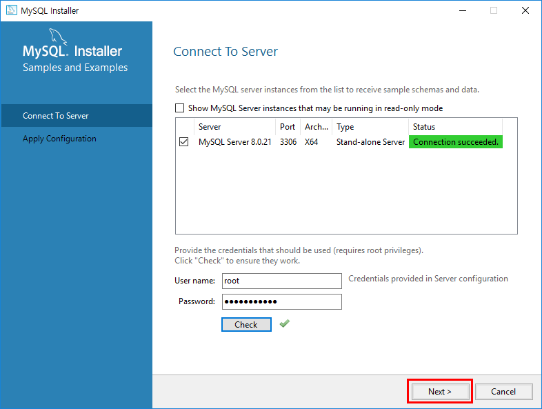 아까 설정한 MySQL의 root 계정의 비밀번호를 입력하고 Check 버튼을 클릭합니다.