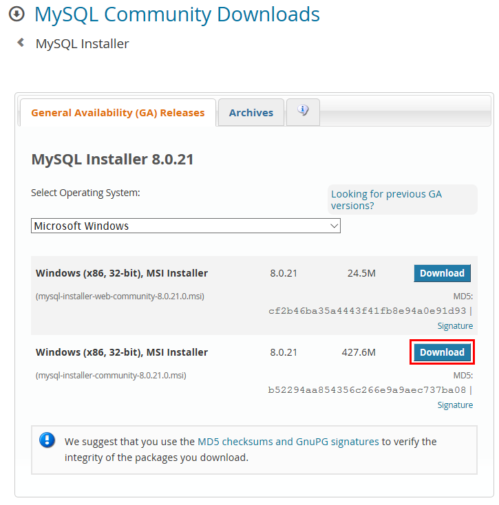 Select Operating System: Select Operating System… Microsoft Windows Select OS Version: All Windows (x86, 32-bit) Windows (x86, 32-bit), MSI Installer 8.0.21 24.5M (mysql-installer-web-community-8.0.21.0.msi) MD5: cf2b46ba35a4443f41fb8e94a0e91d93 | Signat