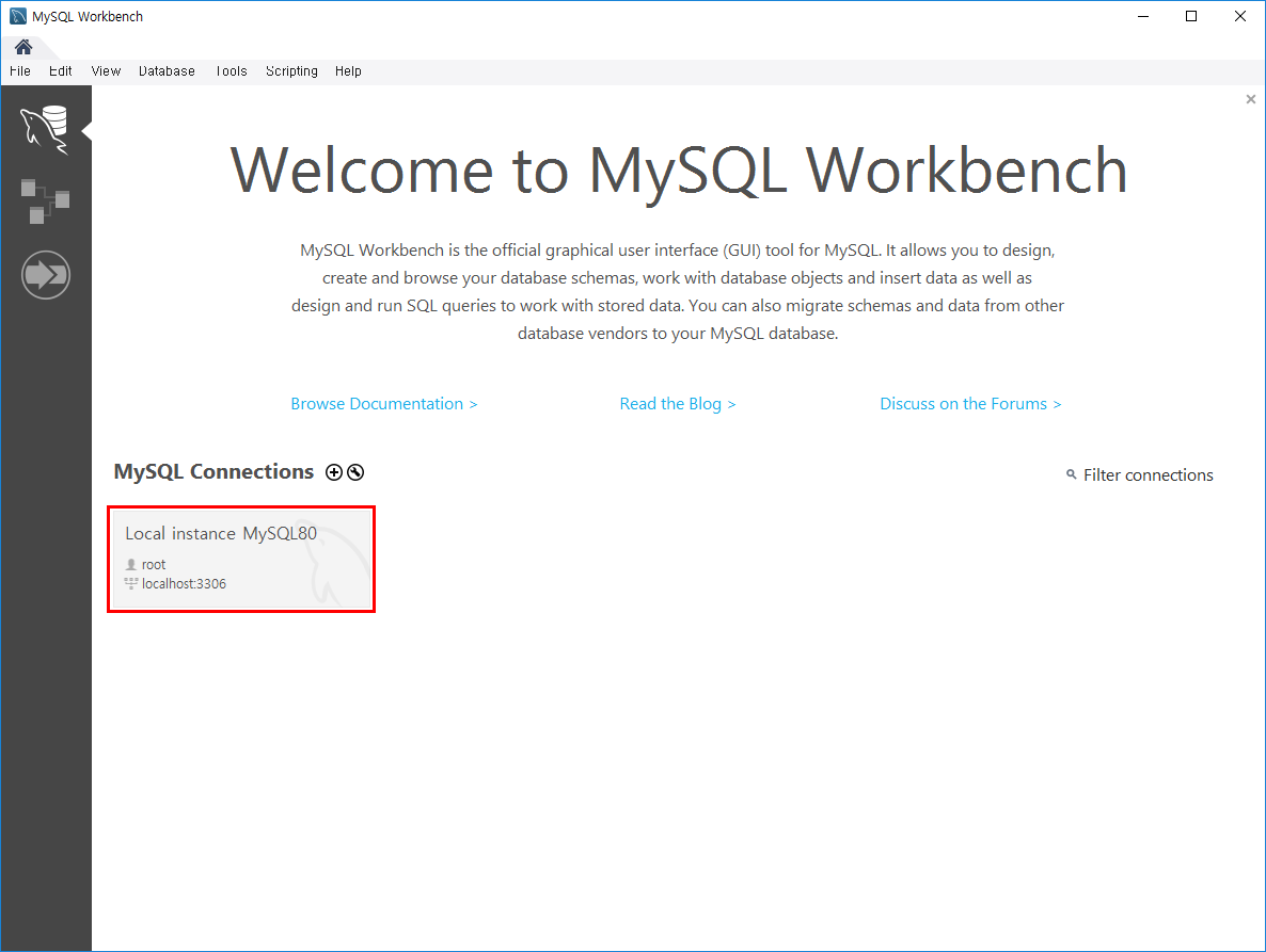 잘 실행이 되었고, 우리가 방금 설치했던 MySQL Server와도 연결이 되어 있는 것을 확인할 수 있습니다.