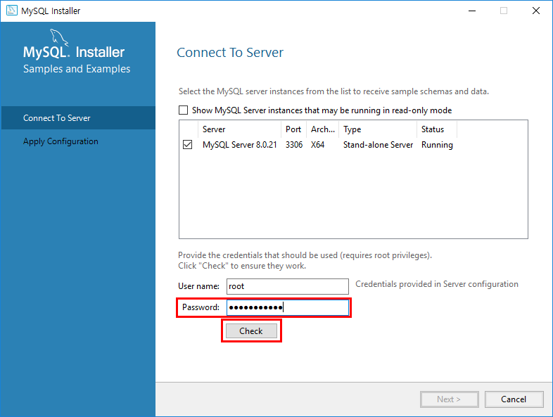 아까 설정한 MySQL의 root 계정의 비밀번호를 입력하고 Check 버튼을 클릭합니다.