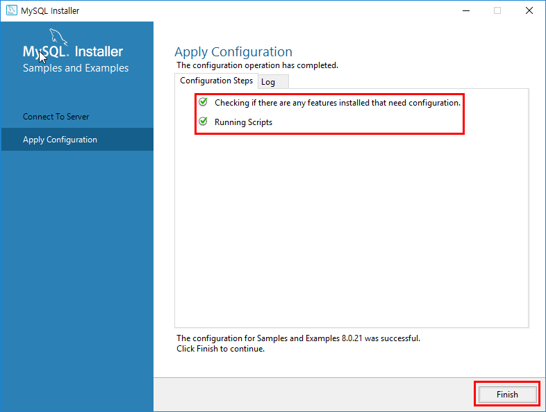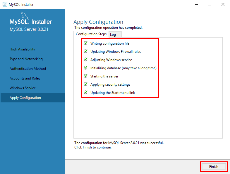Finish를 클릭하여 MySQL Server 설정을 마치겠습니다.