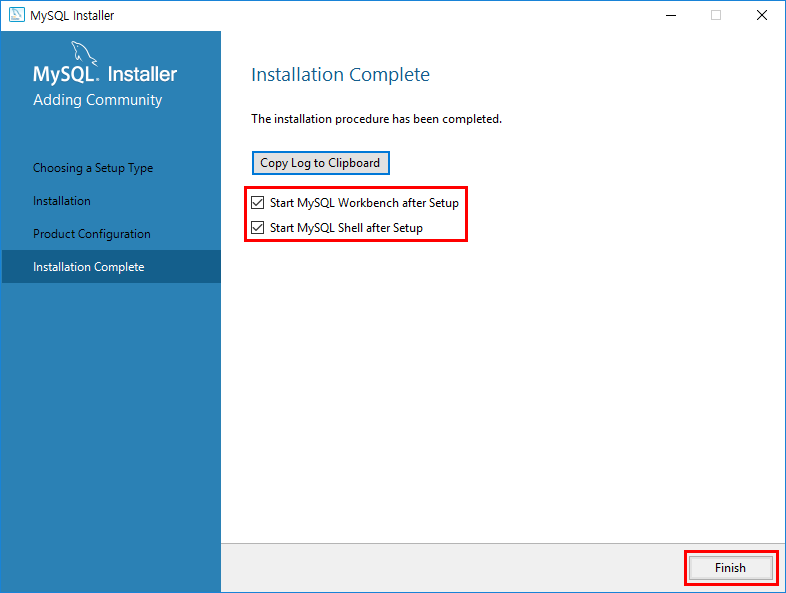 설치를 끝낸뒤에 Workbench와 MySQL Shell이 시작되도록 설정을 하고 Finish 버튼을 누르도록 하겠습니다.