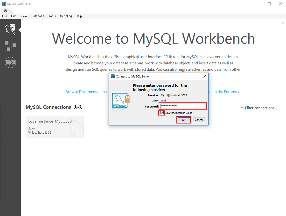 아까 설치 과정에서 설정했던 MySQL root 비밀번호를 입력하고, 저장하기 체크박스를 체크하고 OK 버튼을 눌러줍니다.