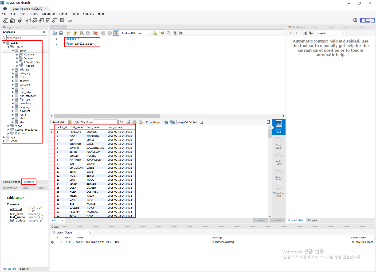 그리고 가운데 제가 "select * from sakila.actor;"라고 입력한 부분이 SQL문을 작성하고 편집하는 화면이 됩니다.