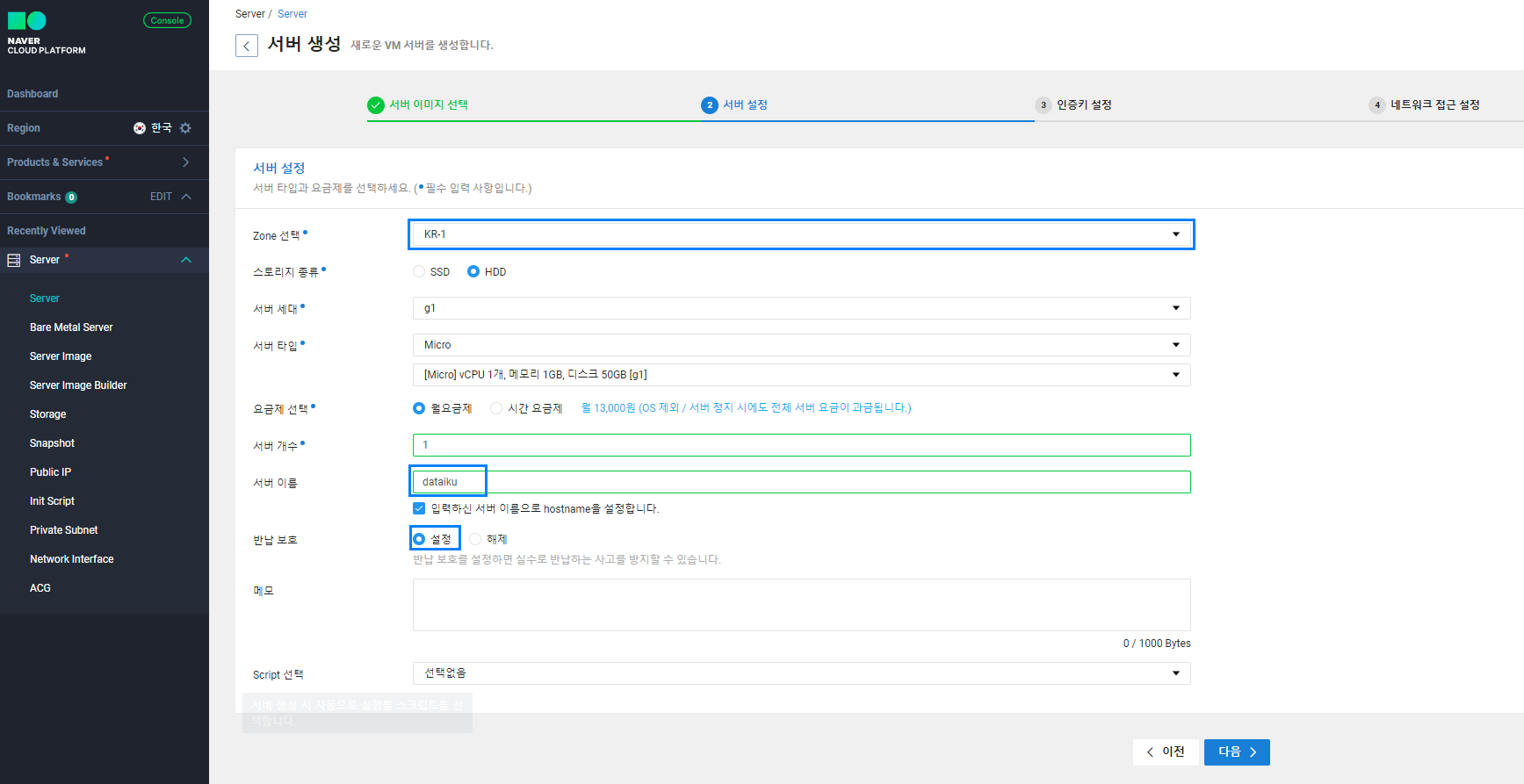 서버 이름도 적어주고, 반납 보호를 설정해주고 다음으로 넘어갑니다.