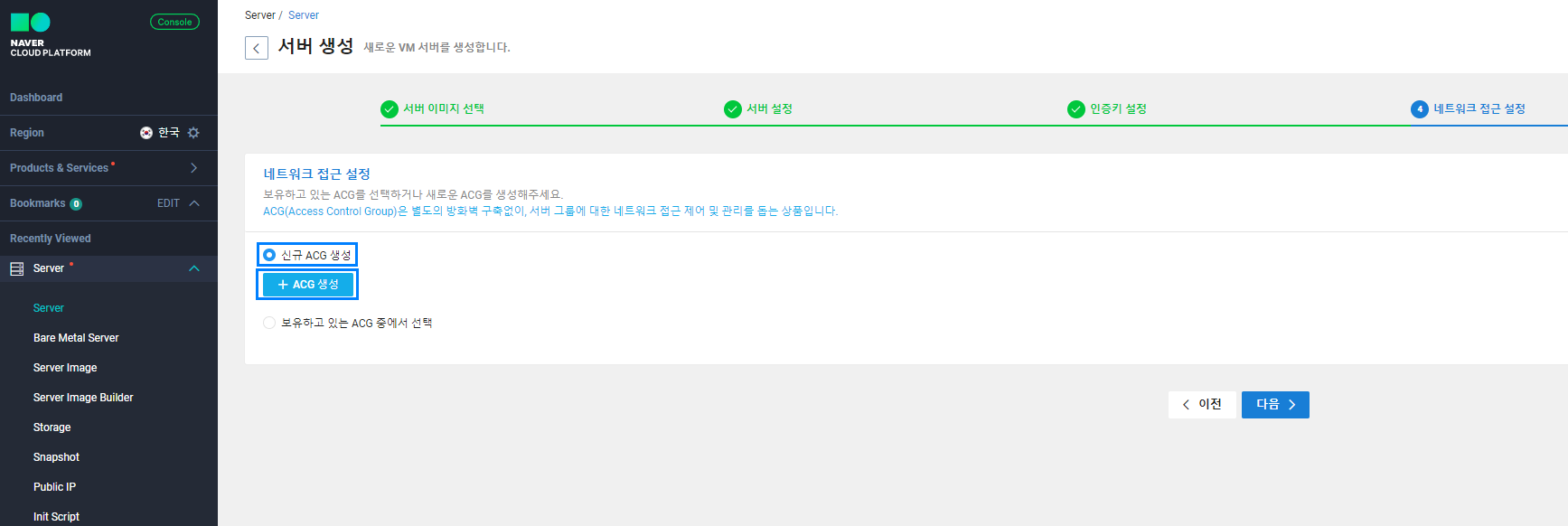신규 생성을 선택하고 아래 ACG 생성 버튼을 눌러줍니다.
