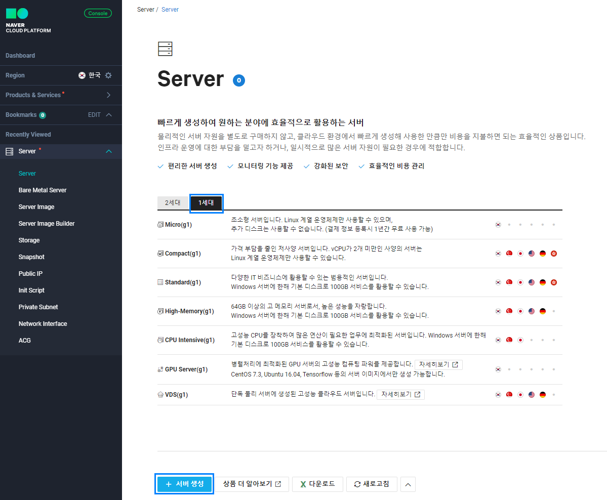 아래와 같은 화면이 나올 텐데, 여기서 1세대를 선택합니다. 그래야 Micro 서버를 선택할 수 있습니다.
