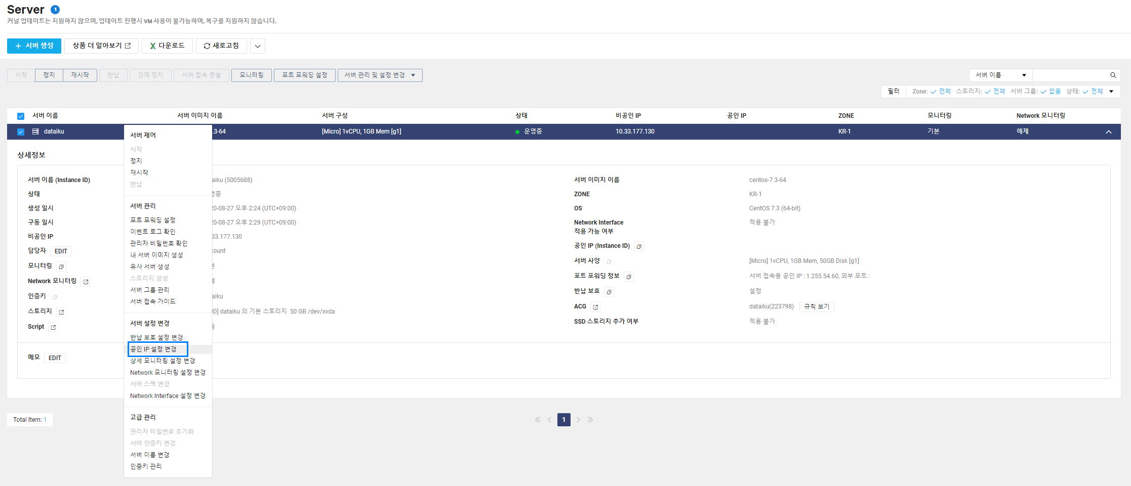 서버 위에서 우클릭을 하셔서 공인 IP 설정을 눌러줍니다.