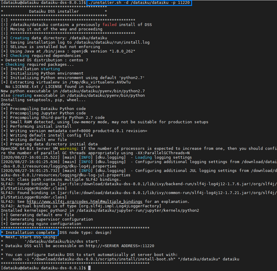 여기서 /dataiku/dataiku 는 dataiku를 설치할 경로를 이야기하고, -p의 11220은 dataiku에 접속할 포트 번호입니다.