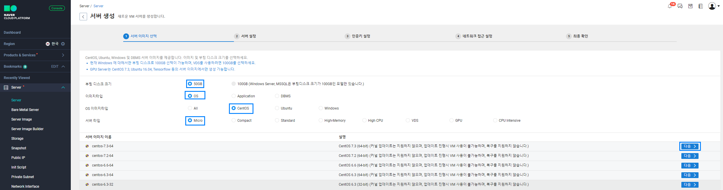 아래와 같이 설정을 하시고 아래쪽 centos 목록 중 가장 위에 것을 선택하여 다음을 눌러줍니다.