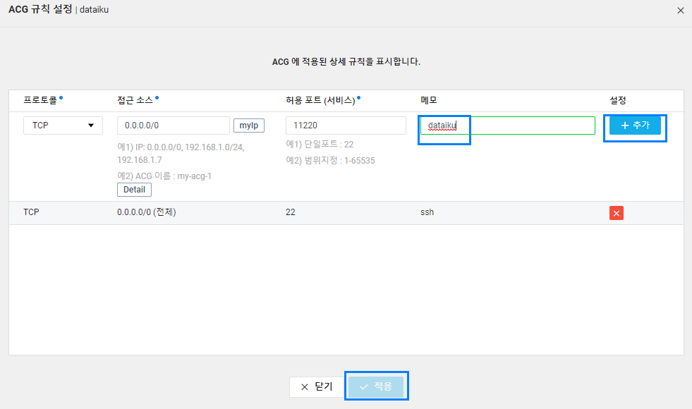 자, 그런데, 우리가 dataiku를 11220 포트로 실행을 할꺼닌깐 네이버 클라우드 플랫폼에서 ACG 설정에 11220 포트를 추가해 주어야 합니다.