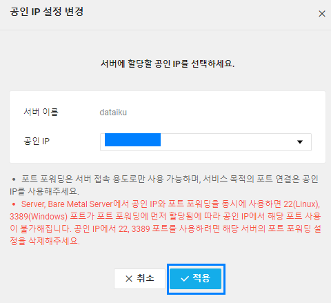 그럼 아래와 같이 창이 하나 열리고, 여기서 가지고 있는 공인 IP를 선택 후 적용 버튼을 눌러주면 됩니다.