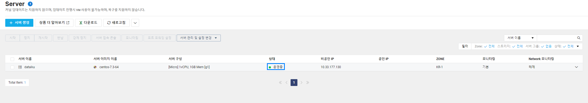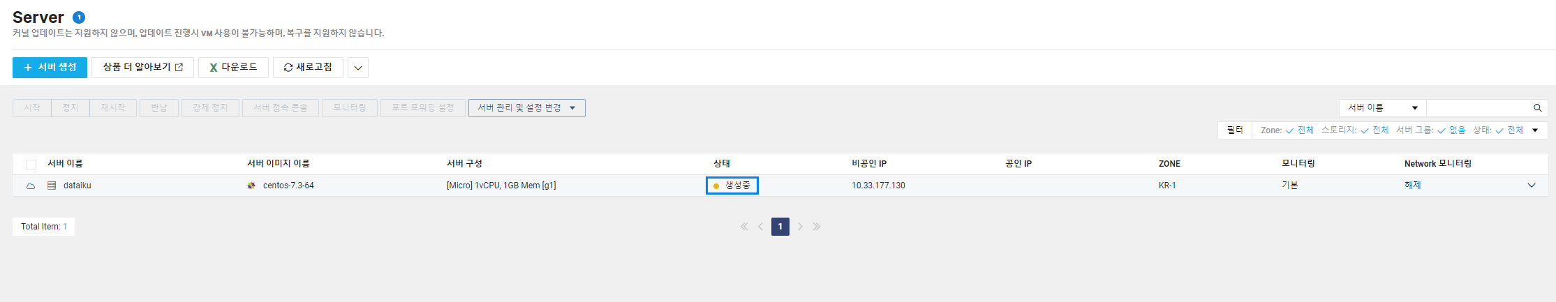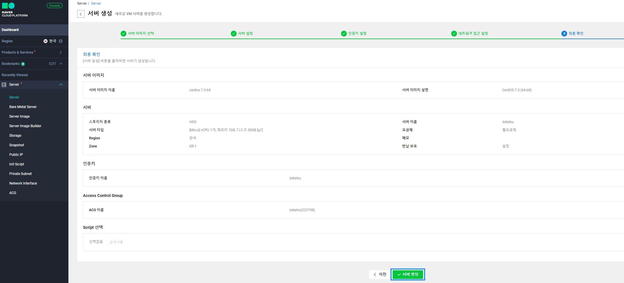 그럼 아래 서버 생성을 눌러서 서버를 생성합니다.