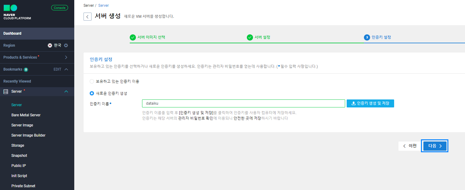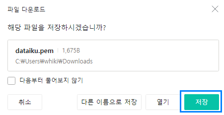 인증키 파일, pem 파일을 새로 생성해줍니다. 이름은 서버 이름과 동일하게 하시는 게 안 헷갈립니다.