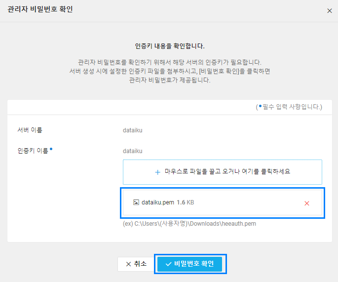 아까 다운로드하였던 인증키 파일 (pem) 파일을 드래그 하여 관리자 비밀번호 확인 팝업창에 올려줍니다.
