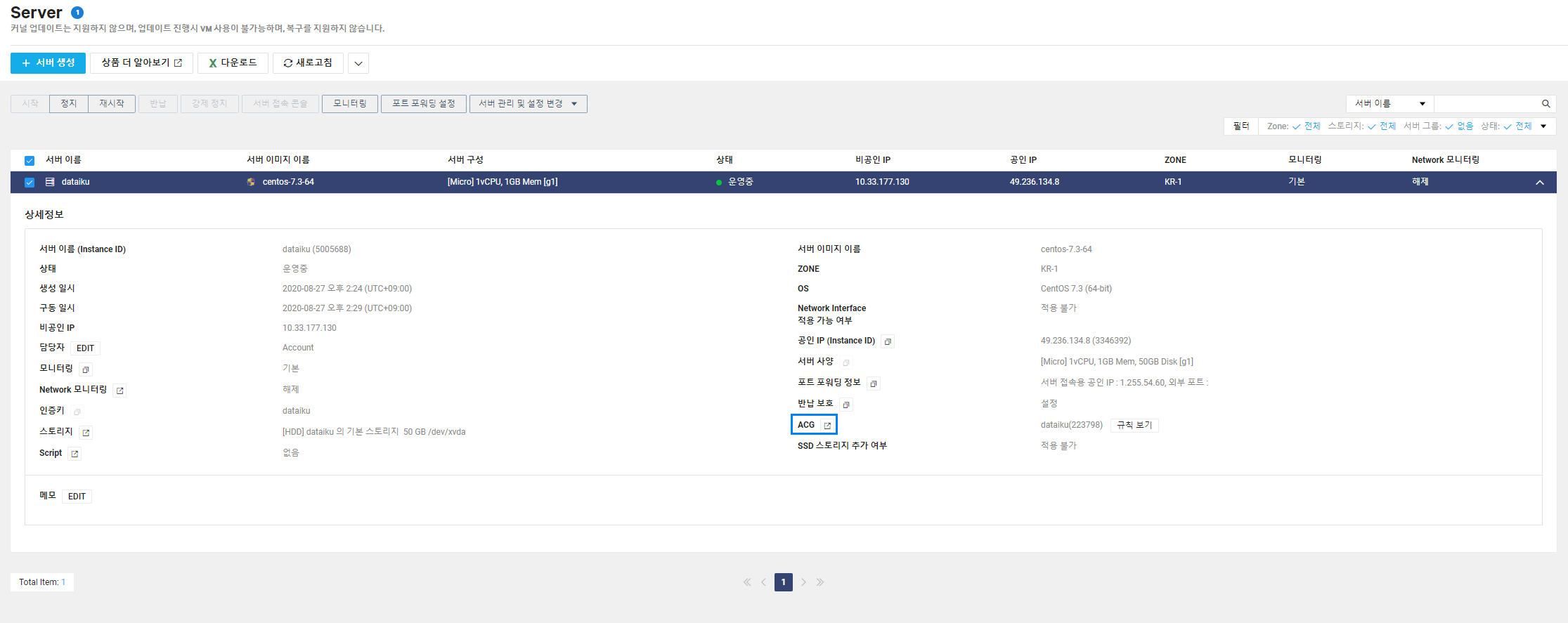 그리고 나면 아래와 같은 화면이 나올 것이고, dataiku서버를 먼저 클릭해주시고, 위에 있는 ACG 설정 버튼을 클릭합니다.