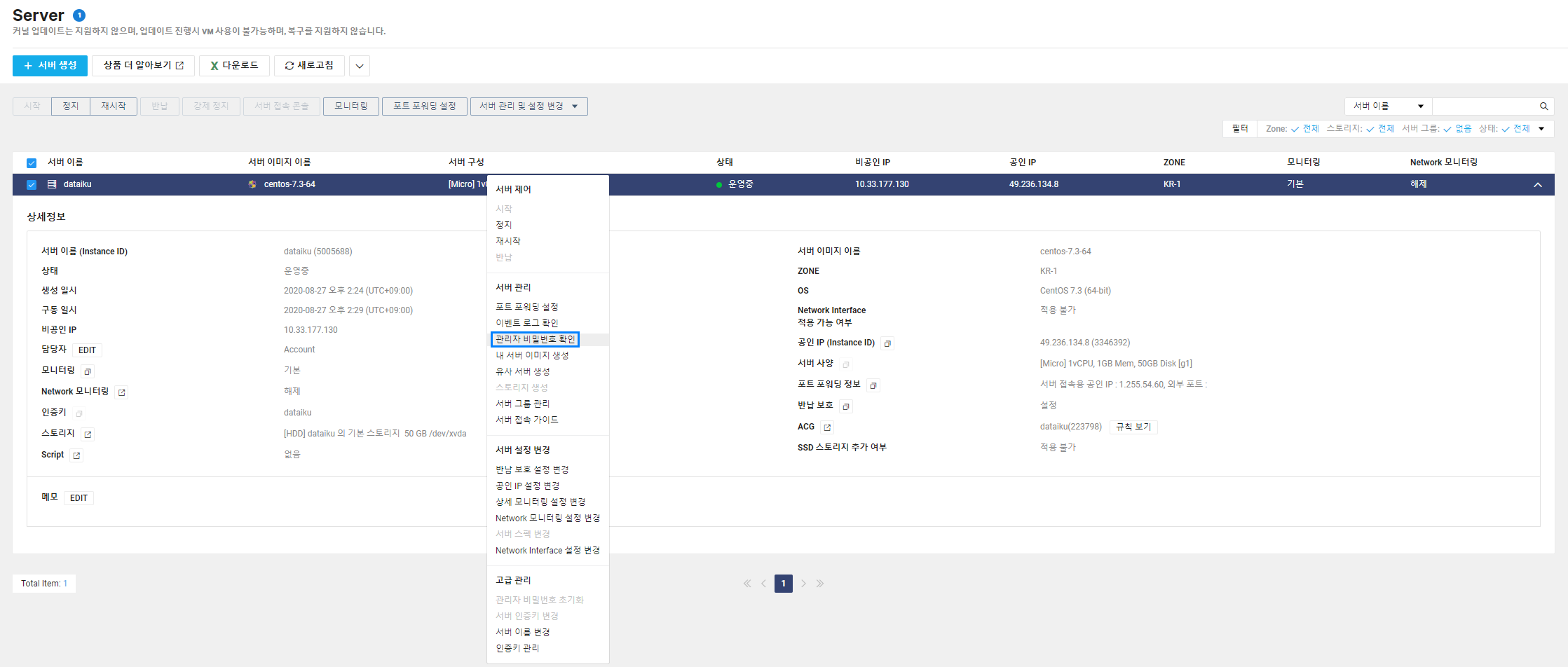 마찬가지로 서버 위에서 우클릭을 하면 관리자 비밀번호 확인 버튼이 있습니다.