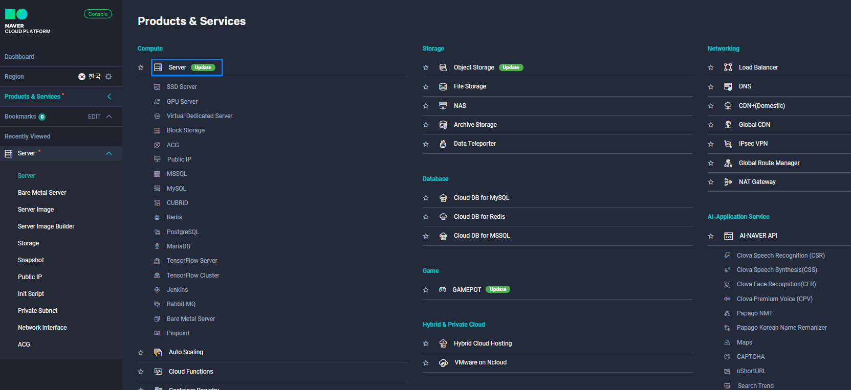 아래와 같이 네이버 클라우드 플랫폼에 로그인하시고, Products & Service에서 Server을 클릭합니다.
