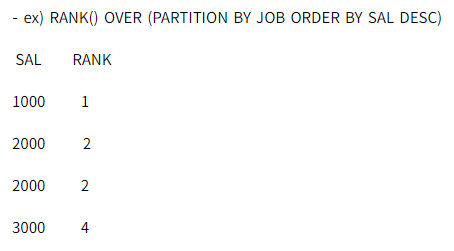 rank 함수는 order by를 포함한 SQL문에서 특정 항목에 대한 순위를 구합니다. 이때 특정 범위를 partition by를 통해서 지정 할 수 있으며, 이러한 옵션 없이 전체 데이터에 대한 순위를 구 할 수 있습니다.