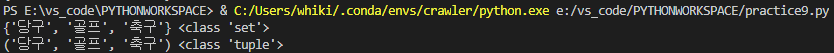 결과 화면을 보면 my_hobby가 set에서 tuple로 자료구조가 변형 된것을 확인 할 수 있고, 그 값이 출력 될때도 원소들의 앞뒤를 감싼 괄호의 형태가 변형 되어 출력 된 것을 확인 할 수 있습니다.