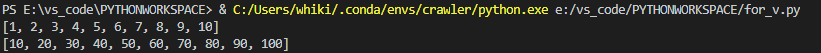 그리고 num10이라는 변수에는 num10 = [i*10 for i in num] 구문으로 num값을 하나씩 불러와 곱하기 10을 하여 저장을 합니다. 그 결과는 아래와 같습니다.