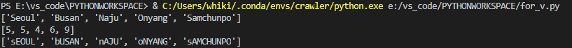 city라는 변수에 ["Seoul", "Busan", "Naju", "Onyang","Samchunpo"] 이렇게 도시 이름을 저장하고 출력을 합니다.