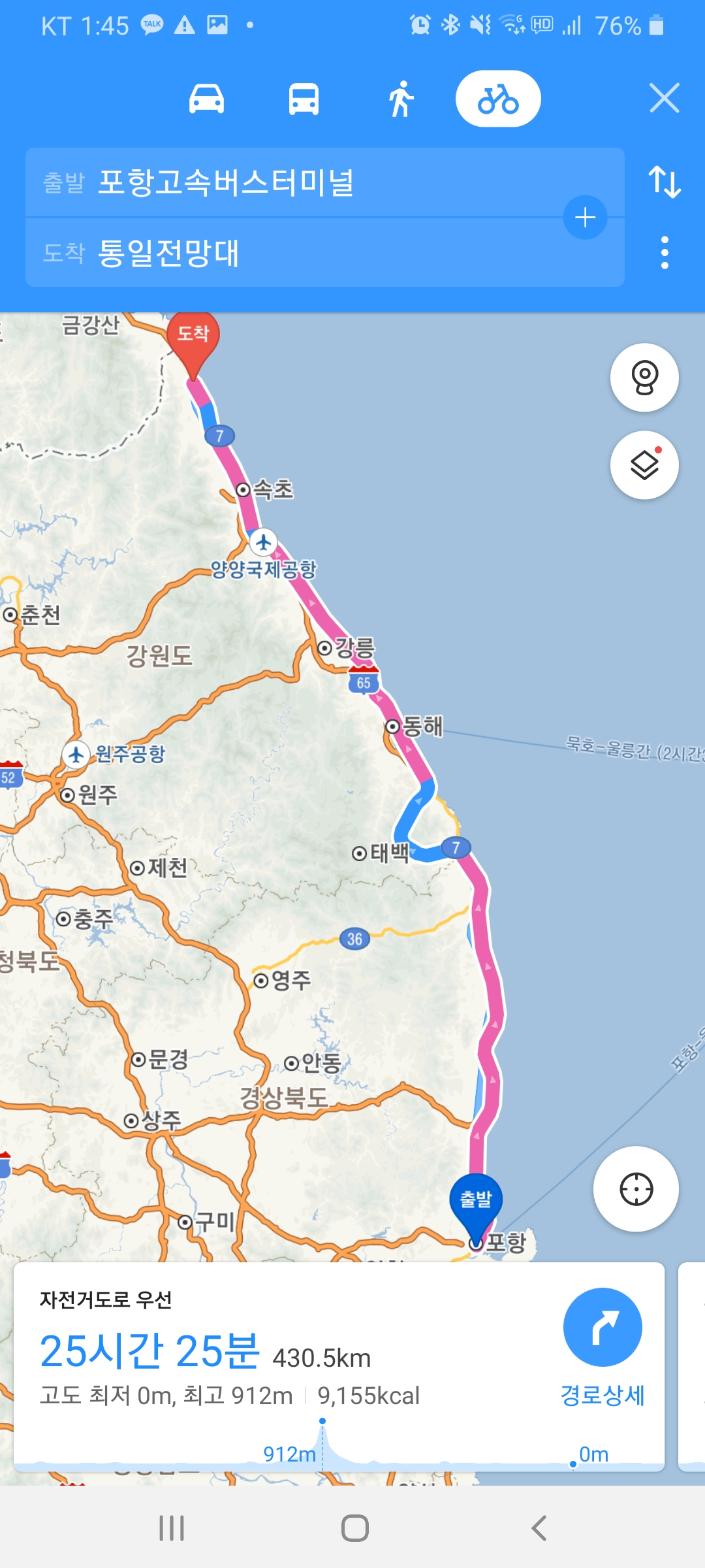 코스는 포항부터 고성 통일전망대 까지 약 430km로 정했습니다. 첫 도전치고 쉽지않겠지만 그동안 연습해왔던 라이딩 실력도 점검하고, 나의 의지의 끝이 어딘지 궁금했습니다.
