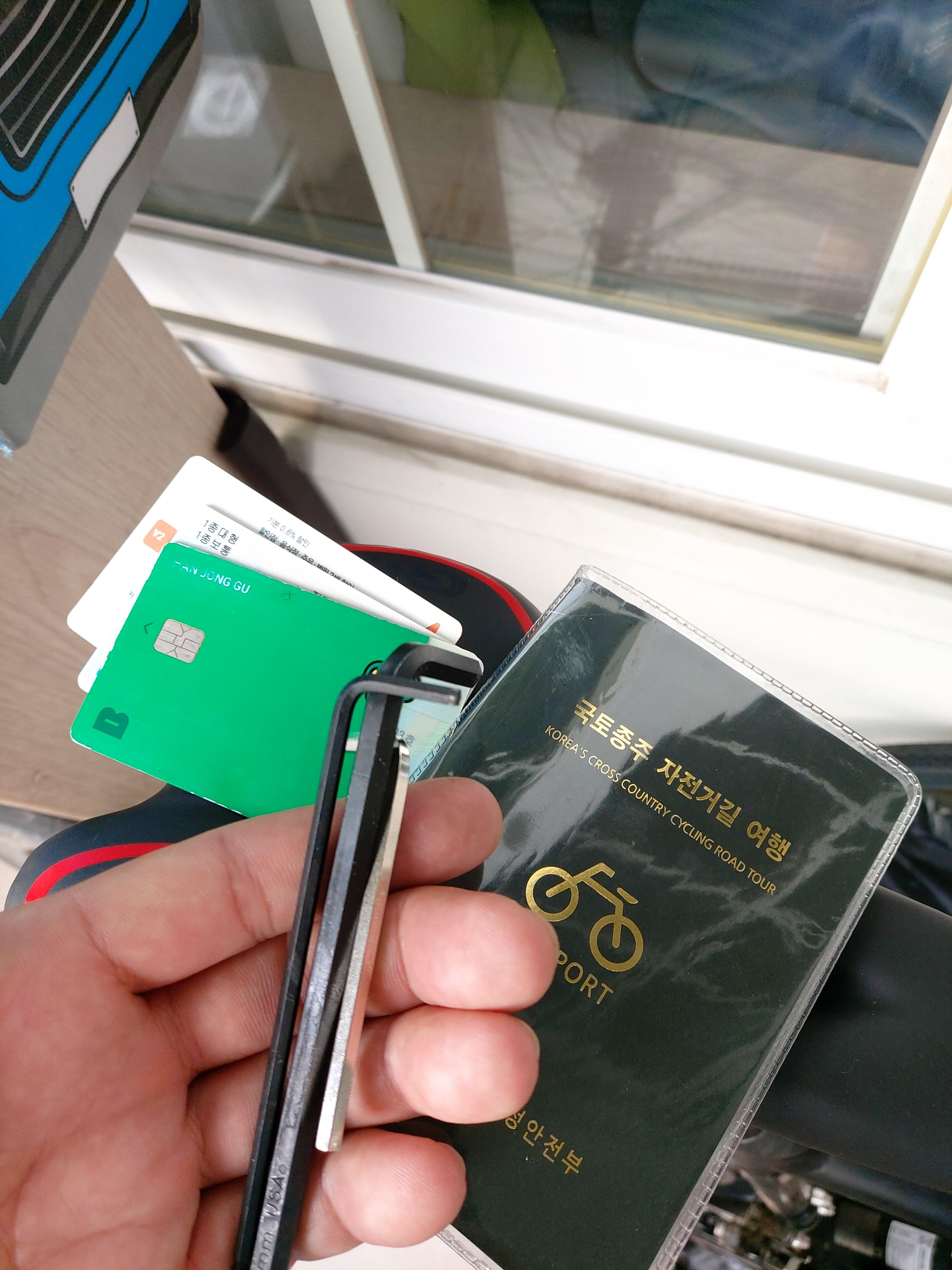 그리고 국토종주 인증수첩 입니다. 체크카드와 신분증, 혹시 몰라 신용카드도 준비합니다.