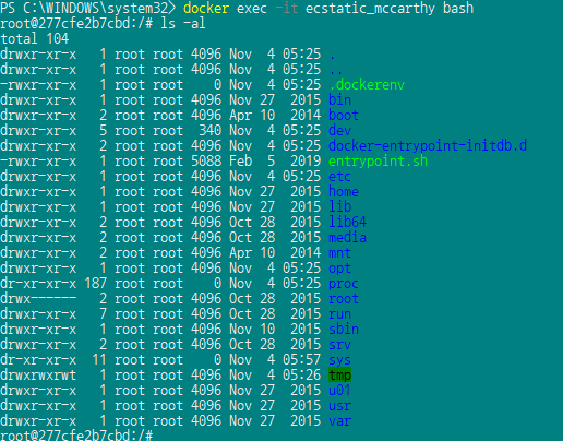 위에서 docker ps -a 명령어를 통해 제 도커 컨테이너의 이름이 ecstatic_mccarthy 라는것을 확인 했습니다.